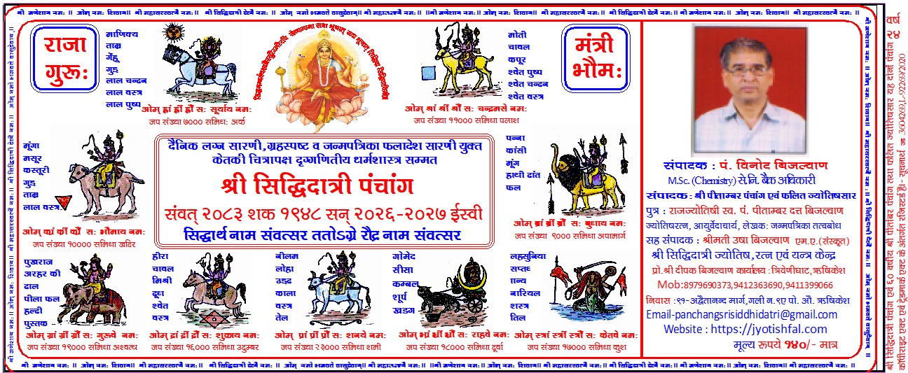 यह ज्योतिषफल वेबसाइट जोकि पूर्व में श्री पीतांबर ज्योतिष के नाम से है मैं अपने पूज्य पिता राज ज्योतिषी वैदिक पंडित पीतांबर दत्त बिजलवान ज्योतिषरत्न दैवज्ञभूषण आयुर्वेदाचार्य की स्मृति में प्रकाशित कर रहा हूं । पूज्य पिताजी की स्मृति में 60 वर्ष का श्री पीतांबर पंचांग एवं फलित ज्योतिष सार ग्रंथ प्रकाशित कर चुका हूं जिसमें की सन 1984 संवत 2041 से संवत 2100 सन 2044 का पंचांग एवं फलित ज्योतिष सार दिया गया है साथ ही प्रतिवर्ष श्री सिद्धिदात्री पंचांग भी प्रकाशित किया जाता है ।ज्योतिष के जिज्ञासुओं के लिए जन्मपत्रिका तत्व बोध भी प्रकाशित की गई है। द्वितीय विश्वयुद्ध के समय मित्र राष्ट्रों की विजय के लिए दिल्ली में एक यज्ञ हुआ था उस यज्ञ के उपरांत हिटलर की सेना हारने लगी थी एवं मित्र राष्ट्रों की विजय हुई ।उस यज्ञ को एक सफलतम यज्ञों में माना जाता है । उस समय उस यज्ञ पर ₹7 लाख व्यय आया था । आज वैसा यज्ञ करने में लगभग 100 करोड रुपए का खर्च आएगा। जिस पांडुलिपि से वह यज्ञ संपन्न कराया गया था वह मेरे स्वर्गीय पूज्य पिता राजज्योतिषी वैदिक पंडित पितांबर दत्त जी ने ही लिखी थी उस समय उन्होंने 2 पांडुलिपियों तैयार की थी । उक्त पांडुलिपि की लगभग 80 वर्ष पूर्व लिखी गई एक हस्तलिखित प्रतिलिपि मेरे पास आज भी सुरक्षित ह ।तत्कालीन नरौली रियासत के राजा पूज्यपिताजी को हाथी में बैठा कर बैंड बाजों के साथ अपने महल में ले गए थे। विश्वास है इस वेबसाइट के द्वारा जनसाधारण के अतिरिक्त पंडित भी लाभ उठा सकेंगे।